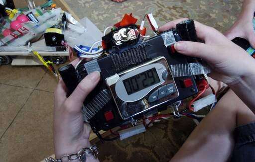 Built by the girls, the remote control box used to operate the robot on the obstacle course looks like something out of the TV series "24." Another control box is used to dump the material once it is collected on the course. Mark Welsh | Staff Photographer