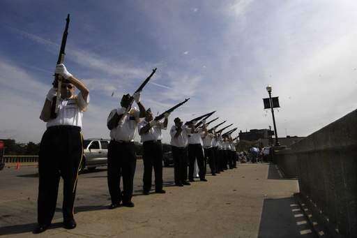 Shell casings fly in the air and litter the concrete as a rifle squad fires rounds over the Fox River from the Highland Street bridge as the Elgin Navy Club, Elgin Marine Corps League and Northern Kane County VietNow host a Memorial Day service. Daily Herald file photo