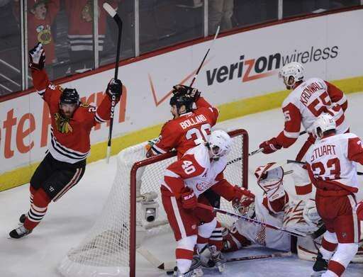 Blackhawks right wing Martin Havlat left, celebrates the Blackhawks second goal past Detroit Red Wings goalie Chris Osgood during the first period of Game 3 of the NHL Western Conference finals. Associated Press