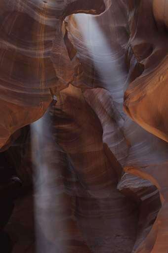 Rays of light beam from openings at the top of the slot canyon from the Upper Antelope Canyon in Page, Arizona.