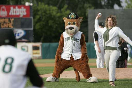 Cougars mascot Ozzie watches as Monica Meyers, Forest Preserve District of Kane County Executive Director, delivers one of the opening pitches at a Kane County Cougars game on Saturday evening.