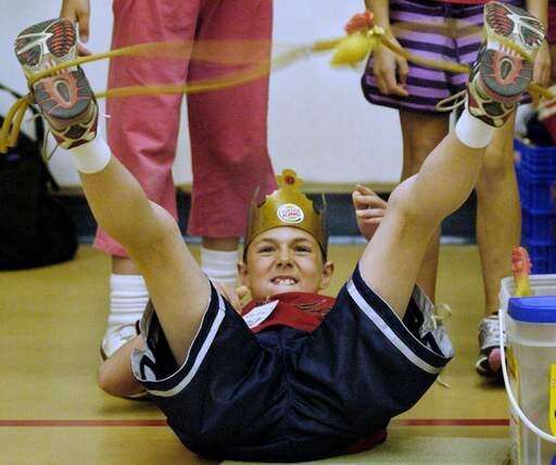 Third-grader Michael Thon launches a rubber chicken toward a waiting Colonel Sanders bucket during the "I feel like chicken tonight" event at Diamond Lake School's end-of-the year field day.