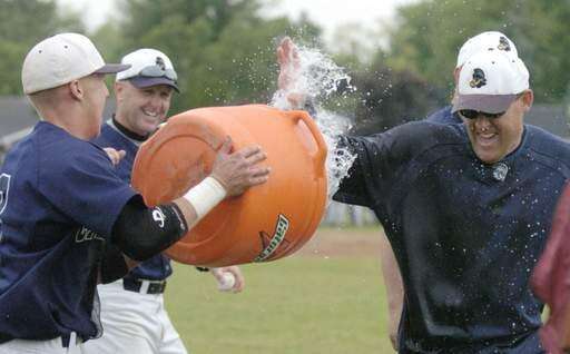 A Cary-Grove coach gets soaked by Chris Waylock after their sectional championship win over Larkin in Dekalb on Saturday, June 6.