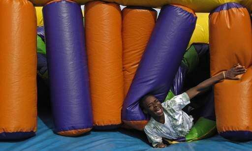 Eighth-grader Terrell Watson emerges from an inflatable obstacle course during Heineman Middle School third annual Relay for Life, a fundraiser for the American Cancer Society.
