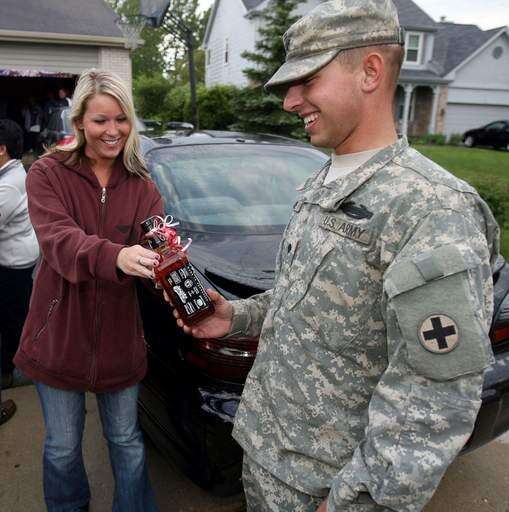 Army National Guard Spc. Adam Krause, 22 gets a bottle of whiskey from his sister Stephanie during a homecoming ceremony at his home in Mundelein after serving in Afghanistan for the last nine months.