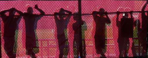 Shadows of baseball fans are cast on the fence screen as they watch the duel between Stevenson and Lake Zurich Thursday in Barrington.