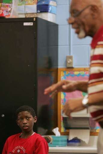 Hillcrest Elementary fifth-grader Devon Chandler listens closely Wednesday to Ernie Broadnax as he talks about his past experiences with segregation. Broadnax, an Elgin resident, is the grandson of Elgin's first black resident.