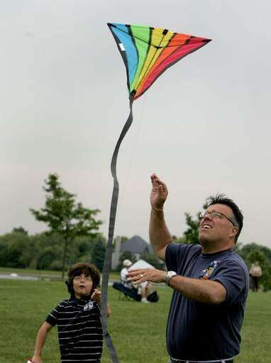 Tom Schrey helps his son Tanner, 8 to get a kite going during the kite flying festival at Frontier Park in Naperville.