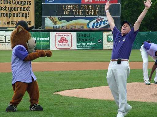 Dr. Edgar Staren, chief medical officer at Cancer Treatment Centers of America, celebrates with mascot Ozzie after throwing out the first pitch during the Kane County Cougars' "Cancer Survivors Day" at Elfstrom Stadium in Geneva.