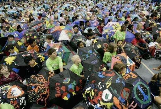 Nancy Young Elementary students made umbrellas for peace as part of a nationwide art project and paraded them around the school Tuesday in Aurora.