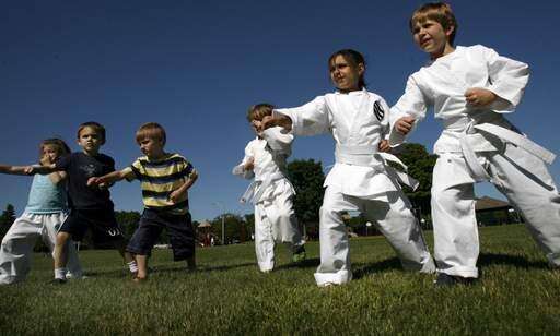 Instructor Mike Celano of Palatine takes his beginning karate class moved outside to Camelot Park Thursday to take advantage of the nice weather. Celano teaches the class for the The Arlington Heights Park District.