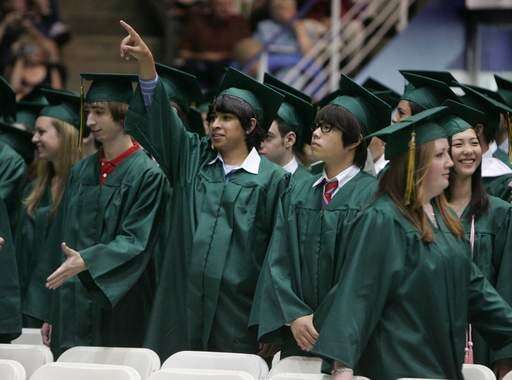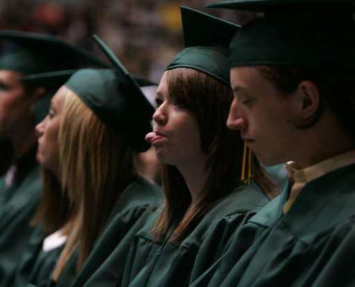 Michelle Rubinstein, left, listens to music from Bradley Sherman's iPhone with Sara Leska before Adlai E. Stevenson High School graduation ceremony at Northwestern University in Evanston on Sunday, June 7, 2009.