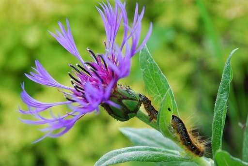 This photo was taken in my backyard on a sunny afternoon. This picture shows an Eastern Tent caterpillar, climbing down a stunning Bachelor Button flower.