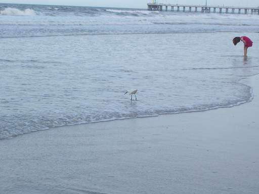 A small bird and a little girl play along the shore on Daytona Beach.