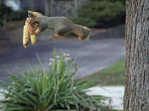 Corn cobs hang from a tree for the squirrels in a yard in Barrington. The wire is positioned so that the squirrels have to jump a few feet to get the corn which makes for playful fun.