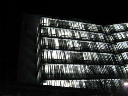 The lights glow from the Crawely building illuminating it at night.