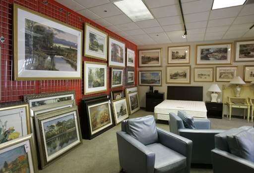 Art work on the wall, once property of the Stanford Financial Group, is on display at AMC Liquidators in Fort Lauderdale, Fla. associated press photo