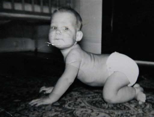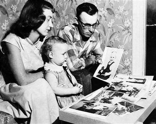 In this July 5, 1956 file photo, Marilyn and Jerry Damman and their daughter Pamela, 1, look a photos of their 3-year-old son, Stephen, at their home in Newton, Iowa.