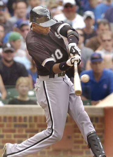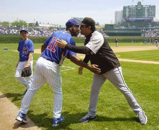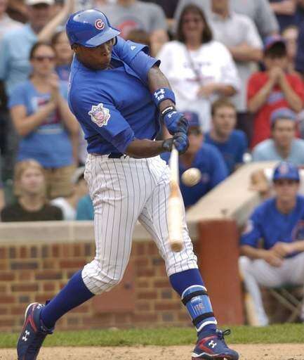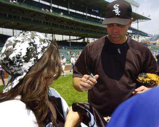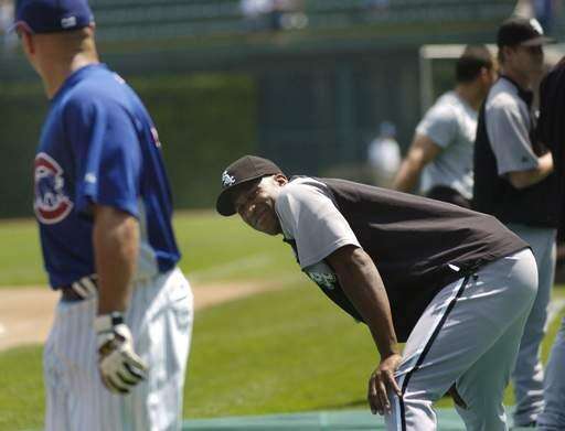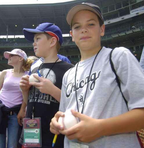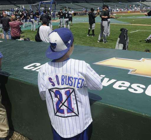 Baseball fan Sam Harris, 12, from of Buffalo Grove, Ill. wears a Sammy Sosa jersey while he watches batting practice before a interleague baseball game between the Chicago Cubs and the Chicago White Sox, Thursday.