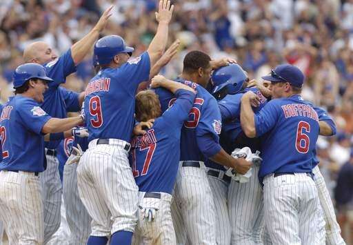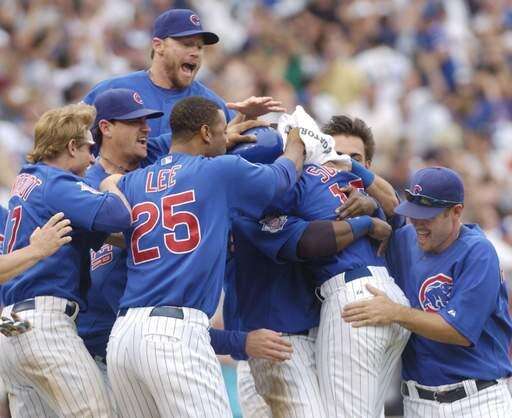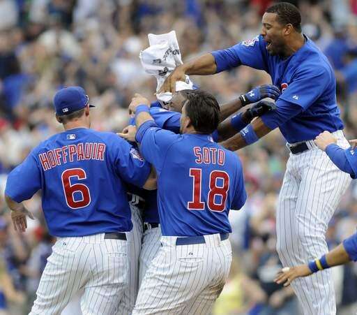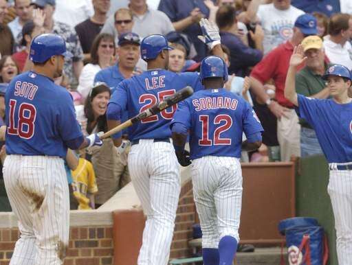 Chicago Cubs' Alfonso Soriano, center, is congratulated by teammates, including Derrek Lee, right, after getting the game-winning hit during the ninth inning of an interleague baseball game against the Chicago White Sox, Thursday.