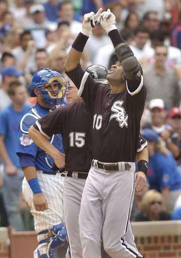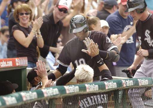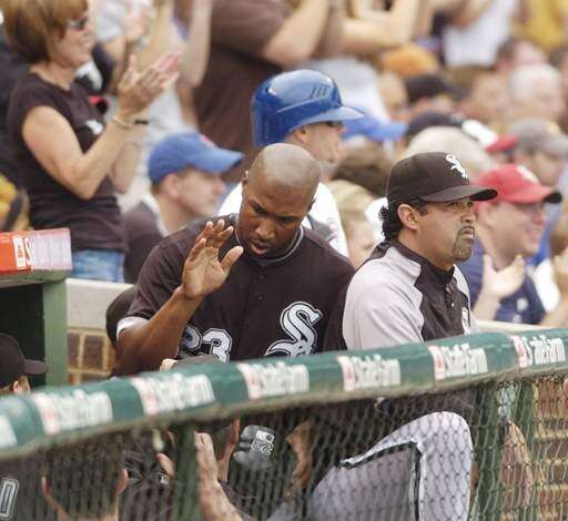 Jermaine Dye is congratulated in the Sox dugout after scoring the first run of the game in the top of the 6th on an RBI single by Brian Anderson.