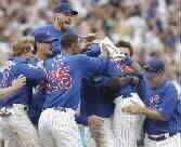 Alfonso Soriano is mobbed by his teammates after getting the game winning hit.