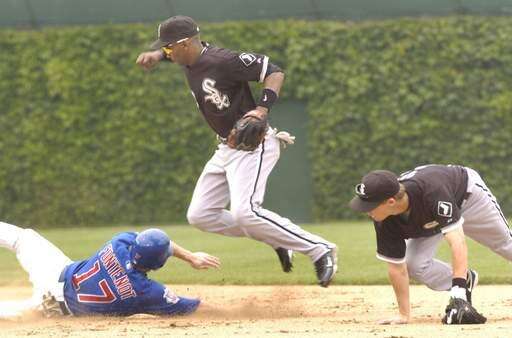 Alexei Ramirez and Chris Getz of the White Sox have trouble forcing out Mike Fontenot at second base in the second inning.