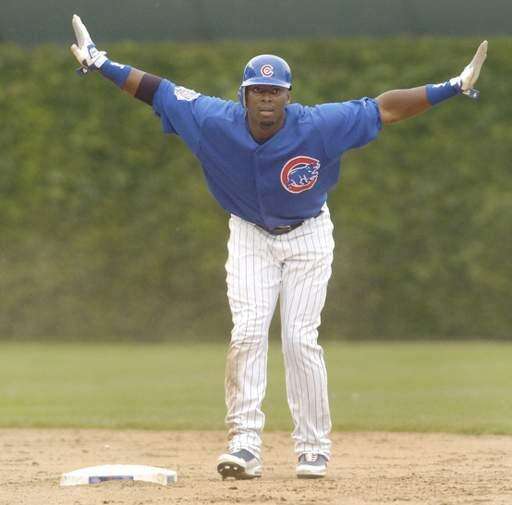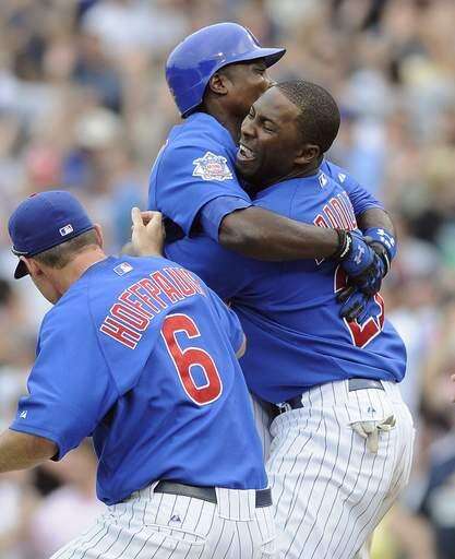 Chicago Cubs' Alfonso Soriano gets a hug from Milton Bradley, right, after Soriano's game-winning hit during the ninth inning of an interleague baseball game against the Chicago White Sox on Thursday, June 18, 2009, at Wrigley Field in Chicago. The Cubs won 6-5. At left is Micah Hoffpauir. (AP Photo/David Banks)