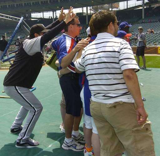 Jake Fox congratulates Milton Bradley during the mob scene after the Cubs 9th inning victory against the Sox.