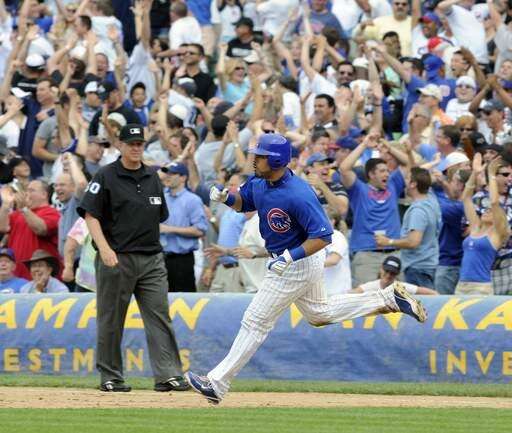 Chicago Cubs' Geovany Soto reacts as he rounds the bases after hitting the game-tying home run during the eighth inning of a interleague baseball game against the Chicago White Sox Thursday.