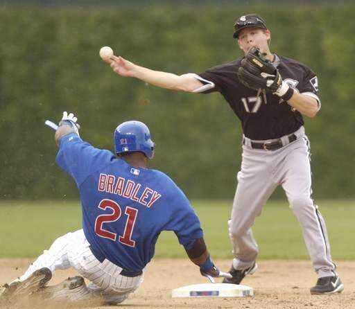Milton Bradley is forced out by Chris Getz at 2nd base in the 3rd inning after Derrek Lee hit into a double play.