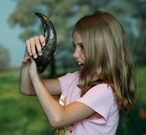 Maddie Burman, 8, of Cary plays with a replica claw of a dinosaur during the "Dinosaur Tales" program at the Lake County Discovery Museum Wednesday. Gilbert R. Boucher II | Staff Photographer