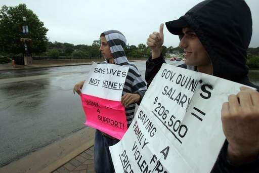 Jason Strackany of Elgin (stripes) and Daniel Ryan, right, also of Elgin protest on the Kimball Street bridge Friday: June 19, 2009 as possible cuts at the community crisis center at 11 a.m. Brian Hill | Staff Photographer