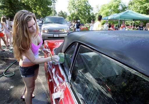 Sixteen-year-old Taylor Joyce works on one of the cars during the St. Charles East High School Drill team's annual car wash fundraiser Saturday: June 20, 2009 in St. Charles. The event raised money to help the girls with the cost of uniforms. Brian Hill | Staff Photographer
