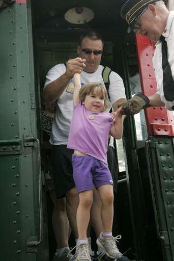 Rachel Baumbich, of Lombard, is helped off a trolley by her father Eric and Conductor Bill Minerly of St. Charles at the Fox Valley Trolley Museum in South Elgin on Sunday afternoon. Kevin Sherman | Staff Photographer