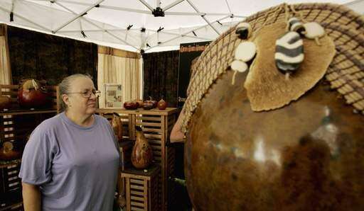 Halina Janusz of Winfield take a close look at the Vine Gourds Sunday during Fine Arts Festival at Cantigny Park, in Wheaton. Tanit Jarusan | Staff Photographer