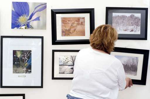 Fine art photographer Joyce Murphy adjust one of her pieces for sale at the Antioch Art Faire in downtown on Sunday. Jason Chiou | Staff Photographer
