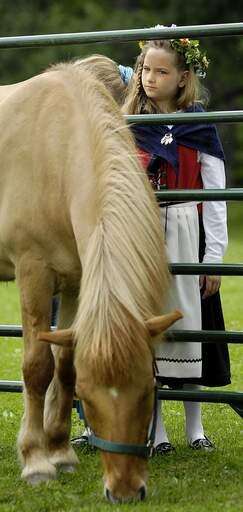 Natalie Cooper wears a Swedish costume while visiting Silvari, an Icelandic horse at the 98th annual Swedish Midsummer Festival in Geneva Sunday. In the back is Mary Chidester, who is also wearing a Swedish costume for their part on stage later. John Starks | Staff Photographer