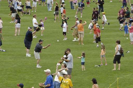 The outfield is filled with families Sunday during a dad and son catch at Elfstrom Stadium before the Kane County Cougars played the Wisconsin TimberRattlers on Father's Day. John Starks | Staff Photographer
