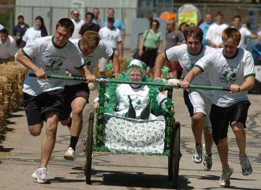 Nuns on the Run team members Tommy Bazan, left, Sister Schmitz, Shane Merriman, Matt Klancic and Tom Barnett take part in the bed races Saturday. This event took place at the Naper Days festival at Naper Settlement. Paul Michna | Staff Photographer