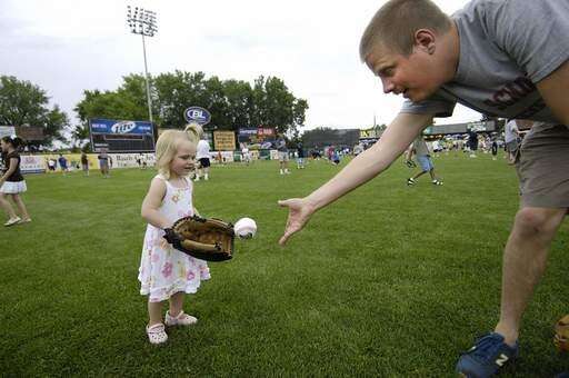 Two-year-old Emma Totsch plays catch with her brother Jeff and dad, Dave, not pictured, in the outfield of Elfstrom Stadium before the Kane County Cougars played Sunday. John Starks | Staff Photographer