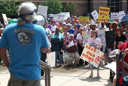 Supporters of Ray Graham Association listen to Geoff Rhoades, who lives in a recovery house, speak into a megaphone at a protest held in a courtyard outside of the DuPage County Courthouse on Friday, June 19, 2009. Brad Meyer | Staff Photographer