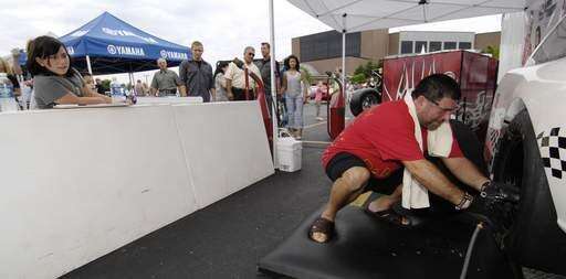 Rena Miceli, 8 watches her dad Geno change a tire at the NASCAR style pit stop tire changing booth at Willow Creek Community Church's annual DadFest in South Barrington. The fest included a car show, live entertainment, food and more. Mark Black | Staff Photographer