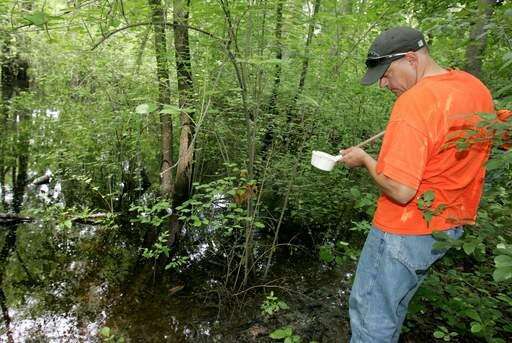 Dan Hawbecker of the Naperville Park District checks for larvae near standing water in Seager Park as part of the mosquito abatement in Naperville. Bev Horne | Staff Photographer