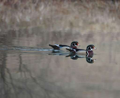 Two wood duck drakes swim together on the calm water making a nice reflection.