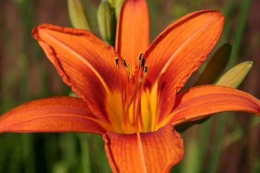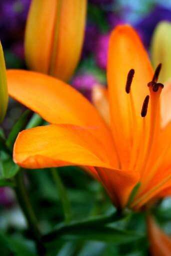 An orange stargazer lily blooms in a garden in June.