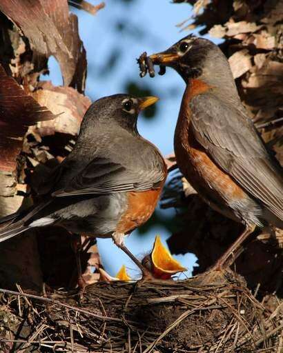 It is feeding time for a family of robins who take up residence on a deck in Mundelein. The parents work hard to feed the hungry babies with worms.