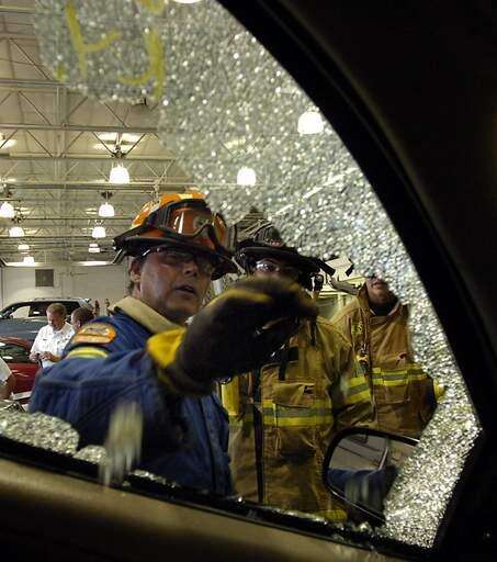 Peter Fiset, central regional manager of Holmatro rescue equipment, knocks out loose glass from a car window during a practice extrication in Schaumburg. Mark Welsh | Staff Photographer