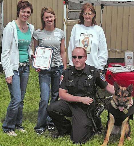Illinois Vest-a-Dog representative Vicki Harrington presented a certificate of appreciation to Popelka and Tammen following the raffles and the ceremonial "vesting" of K9 Indy, the Fox Lake police department's prized German Shepherd.