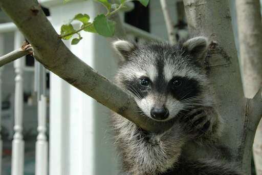 Three baby raccoons have been living in the garage next door. One morning, one of the babies was in the tree next to our front porch. He soon hopped down and ran towards his siblings running towards the garage. Photo by Debbie Dolecki of Villa Park
